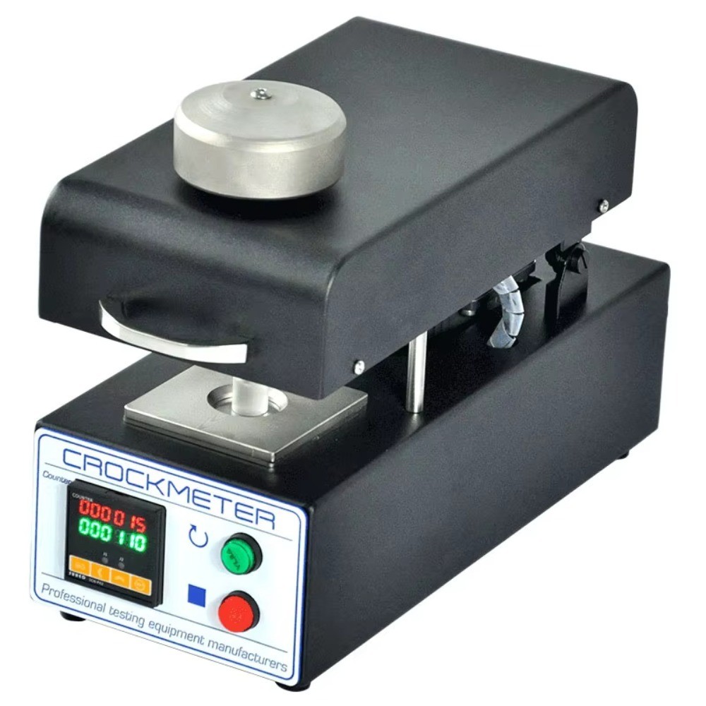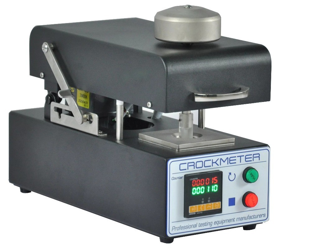 The motorized rotary crockmeter determines the color fastness of textiles to dry and wet friction, especially for printer fabrics. Apply 16g of pressure to the 1134mm finger and rotate 1.125 clockwise, then counterclockwise. However, the operating handle rotates in only one direction.