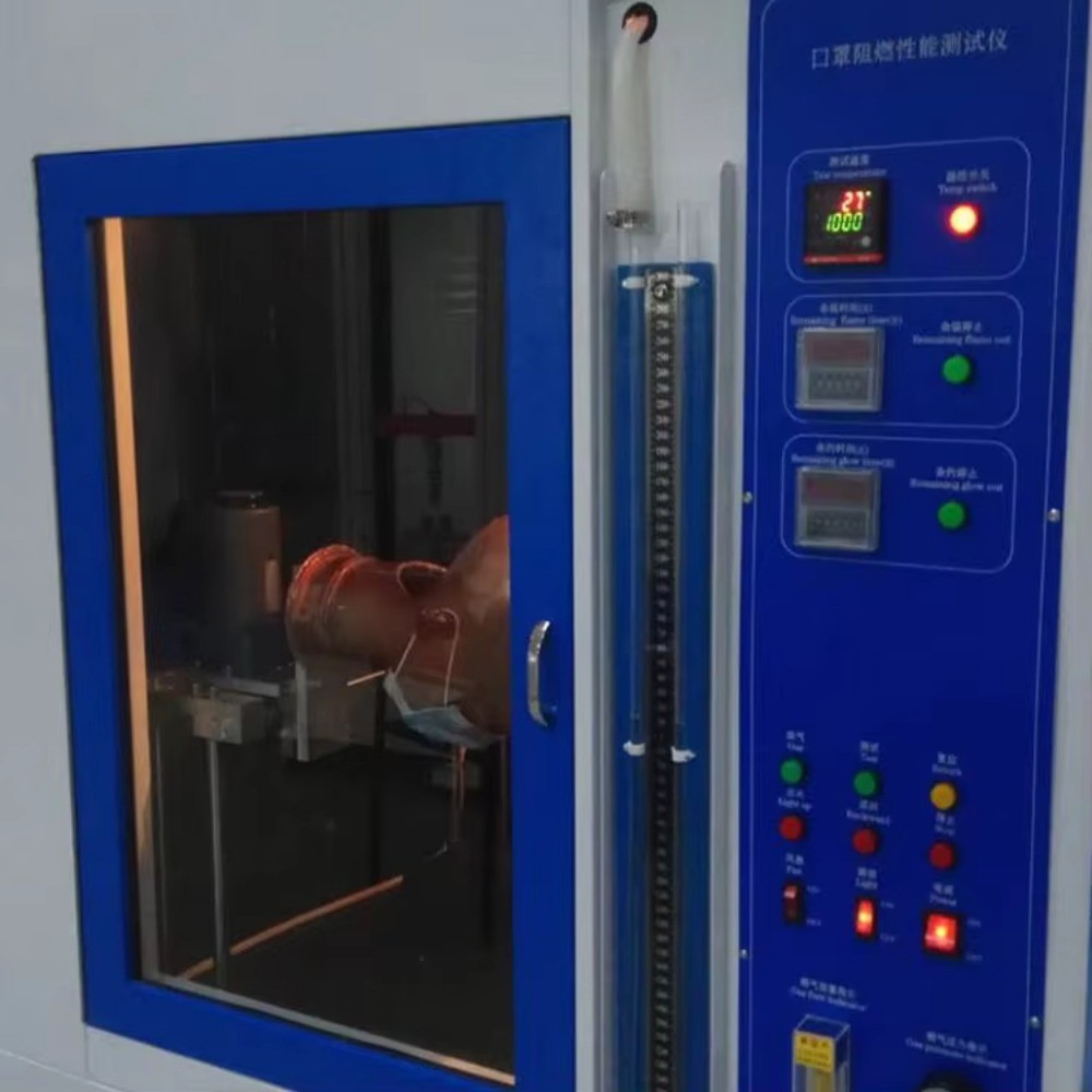 When medical masks are accidentally exposed to flames, their flame retardant properties are directly related to the safety of medical personnel. The flame retardancy of masks is one of the important physical indicators to measure the quality of medical masks. The instrument is tested by mounting the mask sample on the headmold sample holder in simulated actual use. The mask with head mold sweeps the igniter at a certain linear speed at a constant flame height, observes the burning of the mask, and records the continued burning and smoldering time to judge whether the mask is qualified.
