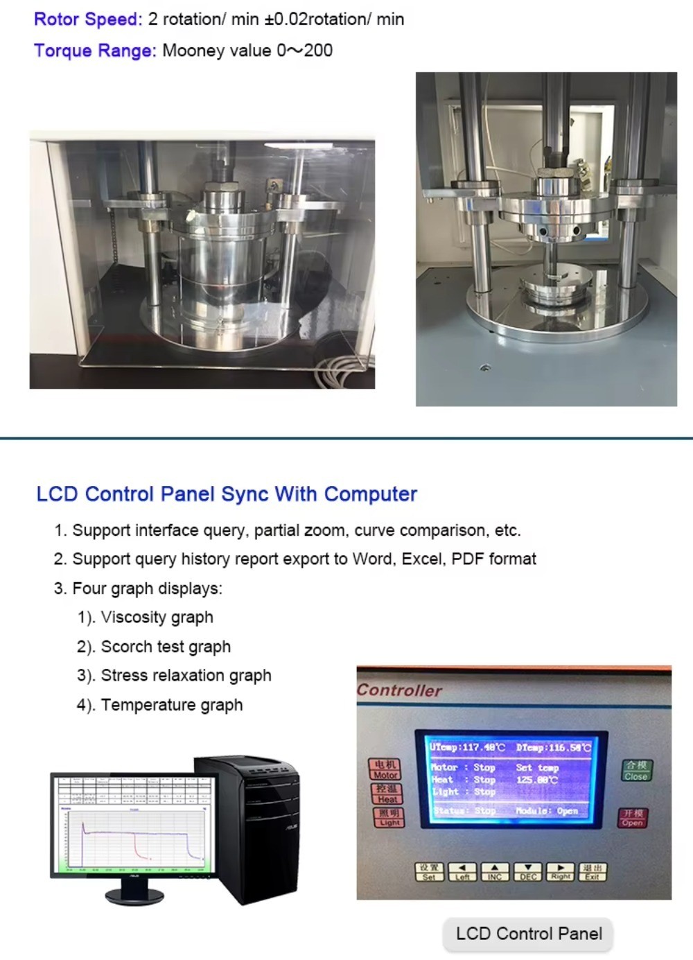 It is designed to determine the viscosity, coking and vulcanization index of raw rubber or rubber. Computer control, data display, automatic calibration, is an ideal experimental equipment for rubber industry and scientific research units. Imported intelligent digital temperature controller, simple adjustment and setting, wide temperature range. The microcomputer adopts imported chips, which have high reliability, and all data can be automatically calculated and printed.