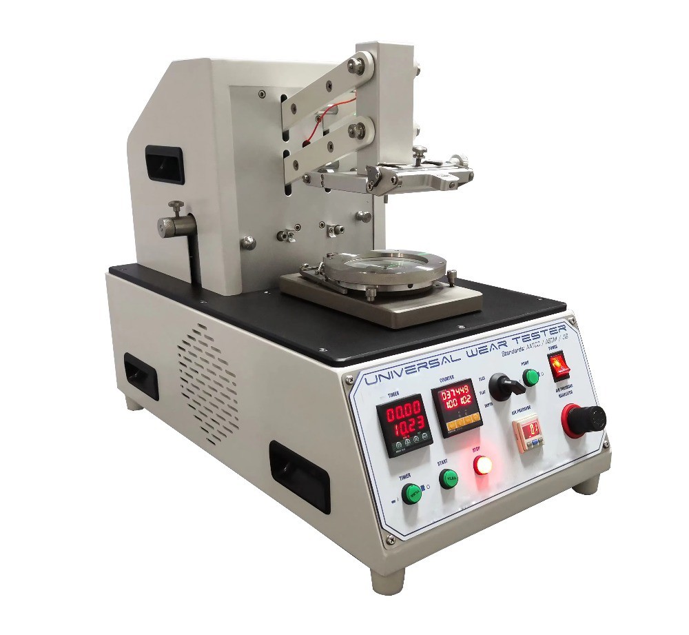 Universal abrasion resistance tester is used to determine the abrasion resistance of fabrics used in clothing, footwear and other industries. Surface wear heads (pneumatic diaphragm method and flex wear heads are available as well as the necessary weight and initial supply of abrasives. Equipped with a built-in timer and mechanical cycle counter.