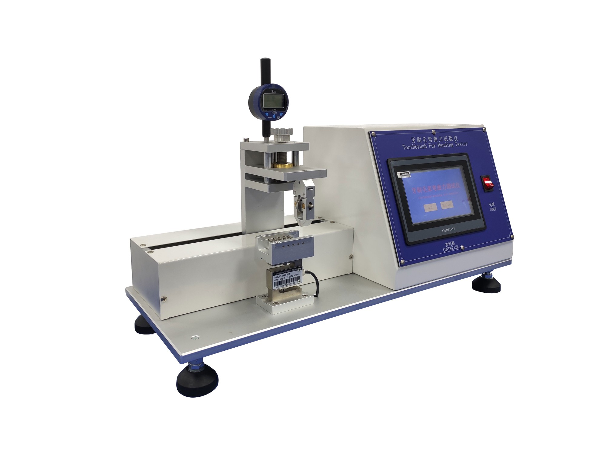 Toothbrush bending strength tester evaluates the strength of the tuft using the force generated by the bristle against bending to classify the tuft strength of the toothbrush. This test is applicable to manual adult hair-transplant toothbrushes and is not applicable to special-type. functional toothbrushes and electric toothbrushes.