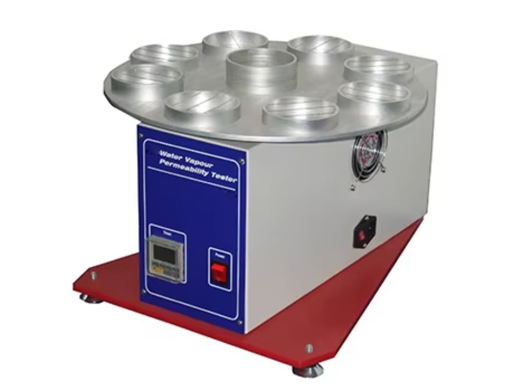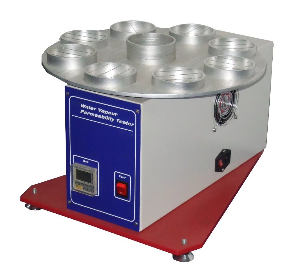 Water vapor permeability tester for the determination of moisture permeability of textiles and textile composites, especially sportswear fabric to water vapor penetration. The water vapor permeability tester consists of 8 containers with water tanks, standard permeable fabric lids, sample retention rings, and precision drive systems.