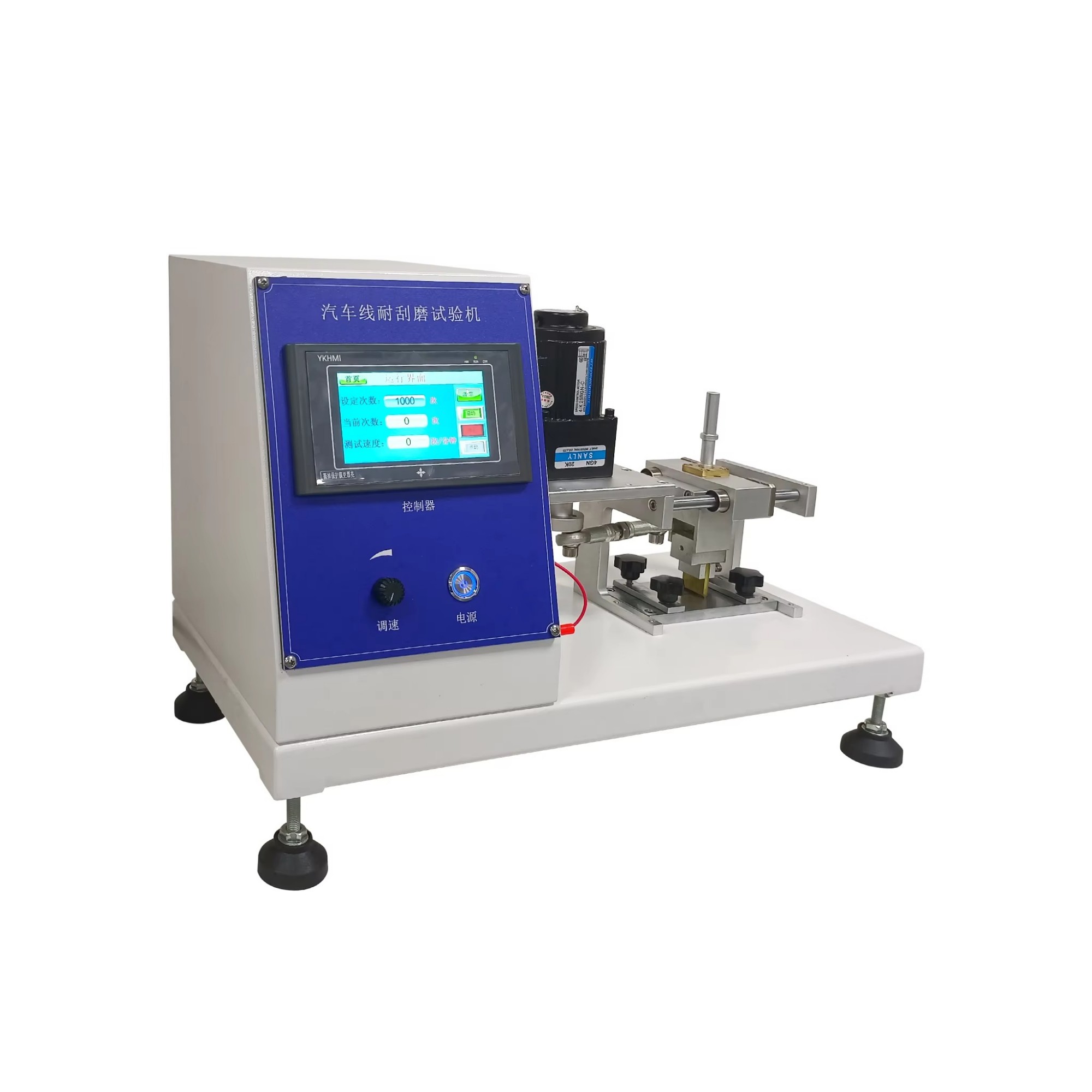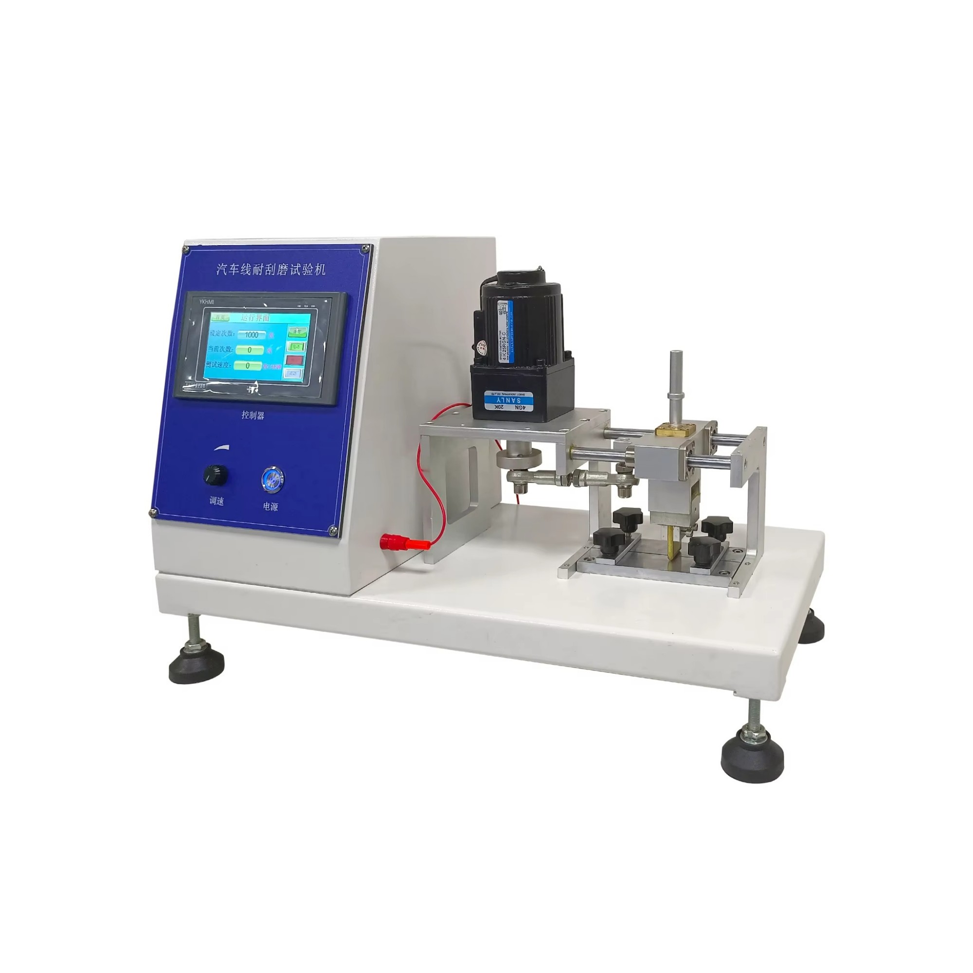 This Wire Abrasion Tester is used to scrape the insulating surface of car wires. The device scrapes the insulating surface reciprocating along the specimen axis, and automatically stops when the scraping needle penetrates the insulating contact conductor.